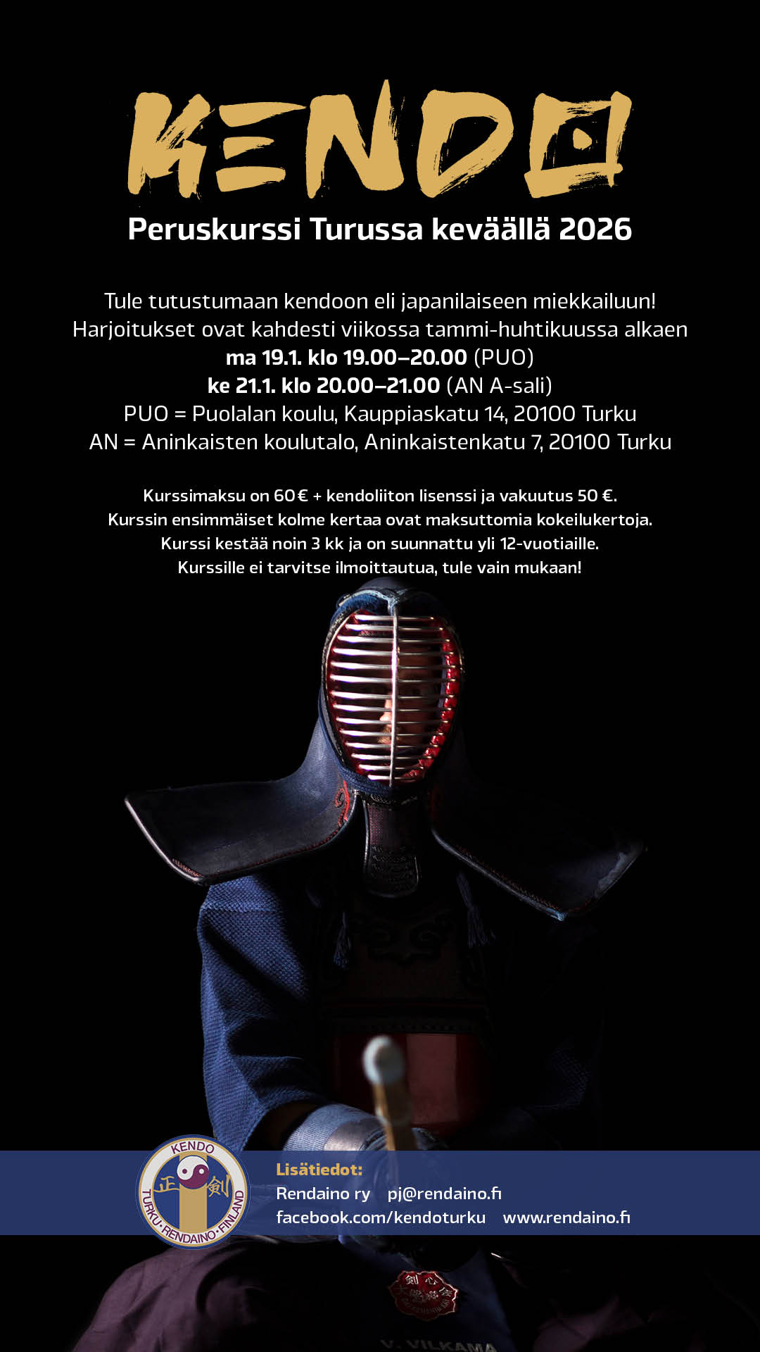 Rendainos grundkurser i kendo startar varje år i september och om möjligt i januari/februari.