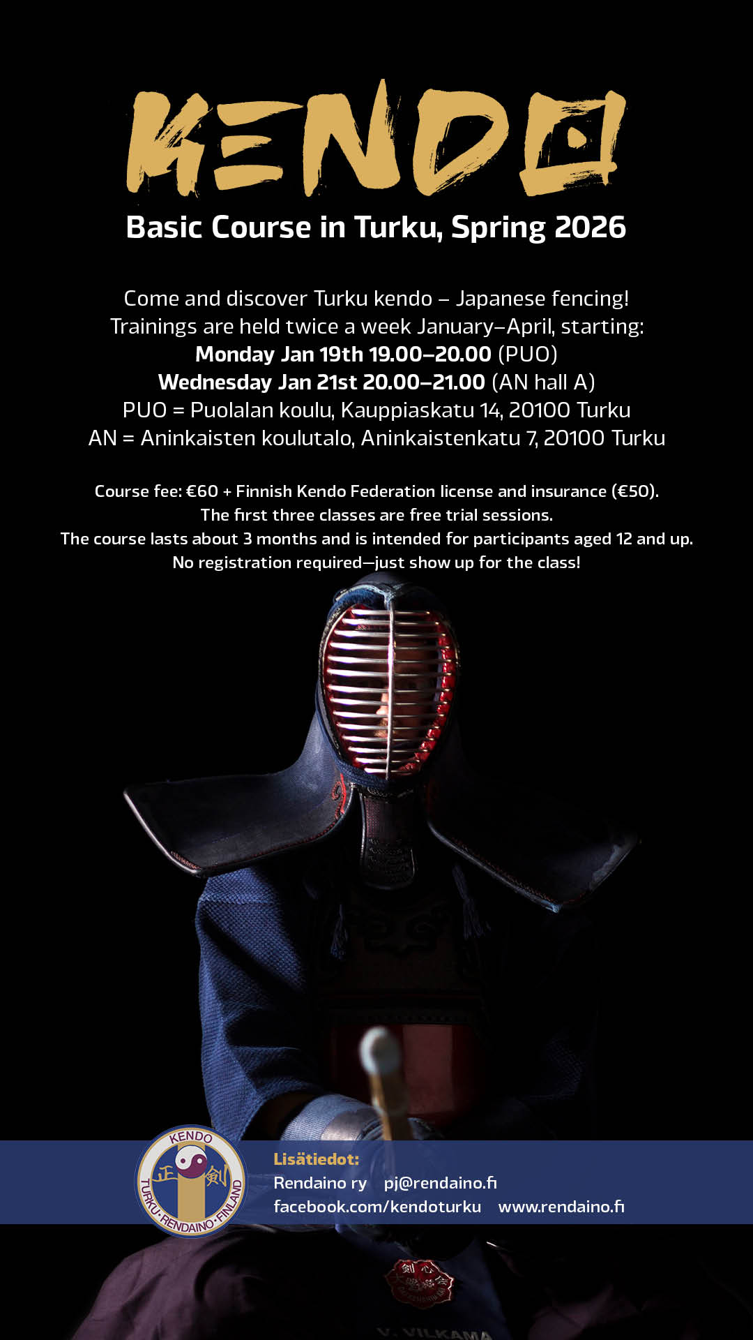 Rendainos grundkurser i kendo startar varje år i september och om möjligt i januari/februari.